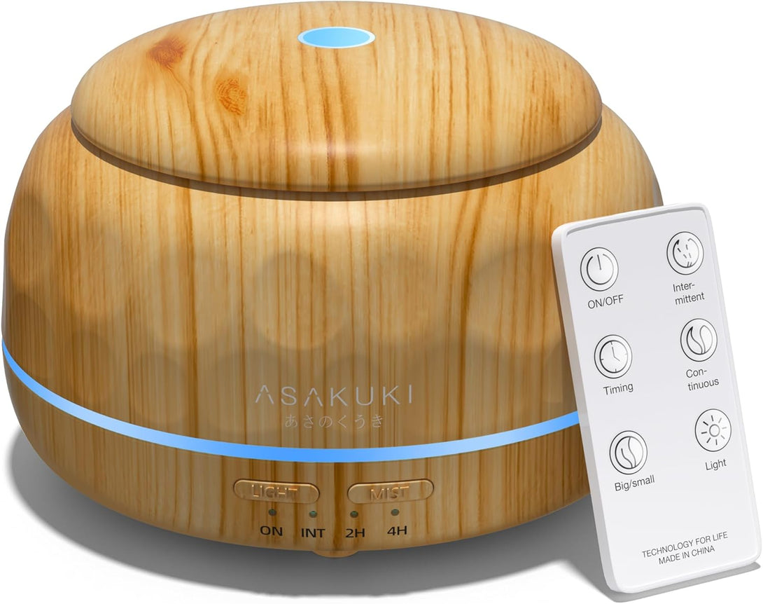 ASAKUKI Essential Oil Diffuser, 300ML Aromatherapy Humidifier with 7-Color Light, Small Home Diffuser with Remote Control for Relaxation -Light Wood