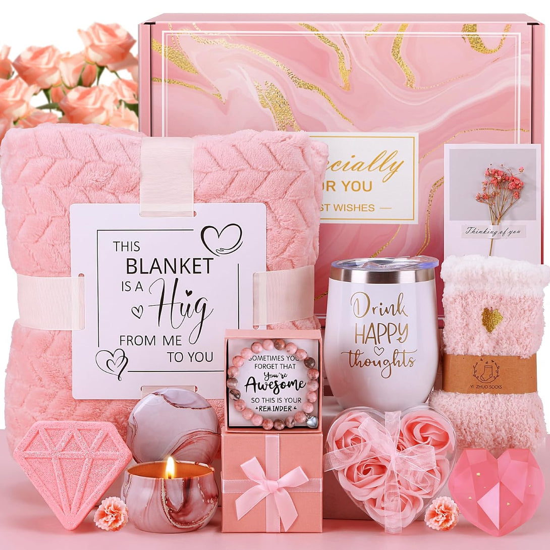 - LUXURY SELF CARE GIFTS FOR WOMEN - BaiCai care package for women customized pink gifts for women including luxurious flannel blanket,12oz "Drink Happy Thoughts" insulated tumbler, rose scented candle, handmade soap, bath bomb, floral-scented soap, "YOU ARE AWESOME"stone bracelet, fuzzy socks, dried flower gift card and elegant gift box. Such a cool & romantic birthday presents for women! All carefully designed with love&care, send this wellness gifts for her to enjoy a cozy & leisure time